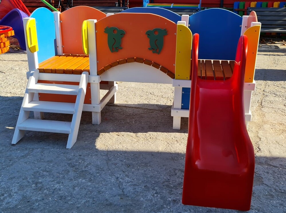 Ansamblu de joaca Minidoi. Echipament de joaca ce este compus din  doua turnuri realizate din grinda stratificata  de rasinoase tratat cu impregnant pe baza  de apa in doua straturi, conferind protective  Uv/intemperii, cu panouri decorative din  WPC.