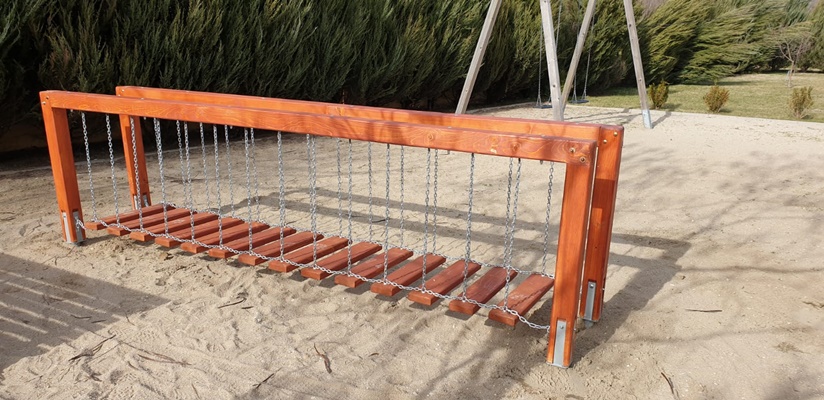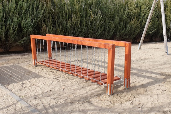 Punte mobila realizata din structura metalica, cu sistem de prindere cu insertie metalica pentru franghie si trepte din lemn. Dimensiuni LxlxH: 300x 60x 4 cm. Suprafata de siguranta: 7,5 m x 3,8 m. Cod: EJPM